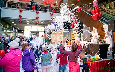 Это веселая музыка, заводные ведущие, воздушные шары, летящая ткань и потрясающий дождь из белоснежной или разноцветной бумаги и разнообразных конфетти.