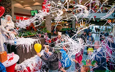 Это веселая музыка, заводные ведущие, воздушные шары, летящая ткань и потрясающий дождь из белоснежной бумаги и разнообразных конфетти.