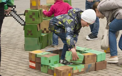Квест в стиле Майкрафт сохраняет атмосферу игры и ее основные принципы. Используется оригинальный объемный реквизит, атрибуты, артефакты и даже подарки в стиле Майнкрафт. Это выездной квест для детей и подростков, и мы выезжаем на место проведения за час для подготовки площадки.
